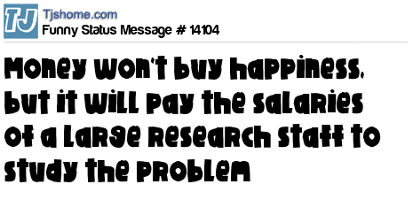 - # 137679 Money not buying you happiness? Wire it into my account and I'll send you pictures of how happy it makes me. Problem solved.