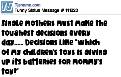 X Single mothers must make the toughest decisions every day...... Decisions like "Which of my children's toys is giving up its batteries for mommy's toy?"