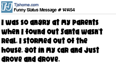- # 141708 Man I was so upset at my parents when they told me that Santa wasn't real, I stormed out of the house, got in my car and just drove and drove