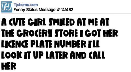 X says A CUTE GIRL SMILED AT ME AT THE GROCERY STORE I GOT HER LICENCE PLATE NUMBER I'LL LOOK IT UP LATER AND CALL HER