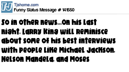 X says So in other news...On his last night, Larry King will reminisce about some of his best interviews with people like Michael Jackson, Nelson Mandela, and Moses