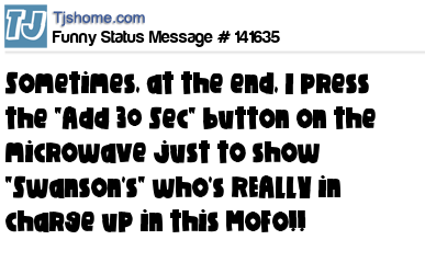 X Sometimes, at the end, I press the "Add 30 Sec" button on the microwave just to show "Swanson's" who's REALLY in charge up in this MoFo!!