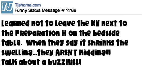 X has learned not to leave the KY next to the Preparation H on the bedside table. When they say it shrinks the swelling...they AREN'T kidding!! Talk about a buzzkill!