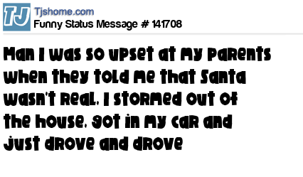 - # 141454 I was so angry at my parents when I found out Santa wasn't real, I stormed out of the house, got in my car and just drove and drove.
