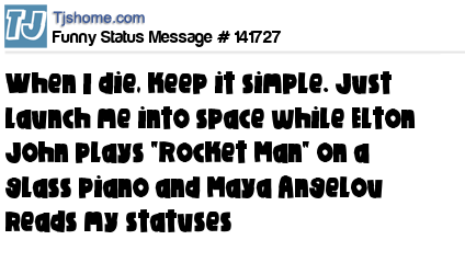 X says When I die, keep it simple. Just launch me into space while Elton John plays "Rocket Man" on a glass piano and Maya Angelou reads my statuses