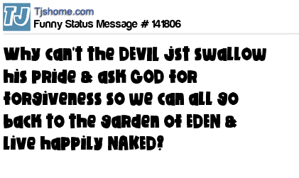 - # 124717 Why can't the devil just swallow his pride and beg GOD 4 forgiveness so we can all go back to the Garden of Eden & live happily NAKED.