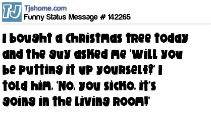 - # 119078 Just bought an artificial Christmas tree and the clerk asks me, “Will you be putting this up yourself?” “NO YOU SICK CRAZY NUT!! I'm putting it up in my living room!”