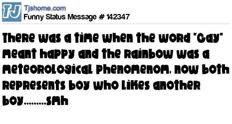 X says There was a time when the word "Gay" meant happy and the rainbow was a meteorological phenomenom, now both represents boy who likes another boy.........smh