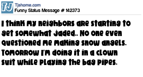 X says I think my neighbors are starting to get somewhat jaded.. No one even questioned me making snow angels. Tomorrow I'm doing it in a clown suit while playing the bag pipes.