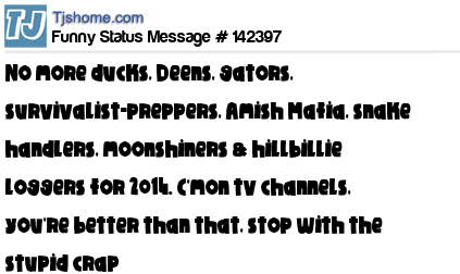 X says no more ducks, Deens, gators, survivalist-preppers, Amish Mafia, snake handlers, moonshiners & hillbillie loggers for 2014. C'mon tv channels, you're better than that, stop with the stupid crap