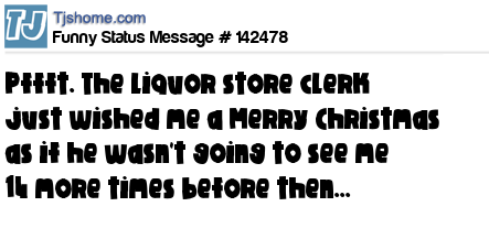 - # 173277 ....... HA ... The liquor store clerk just wished me a Merry Christmas as if she weren't going to see me 12 more times before then.