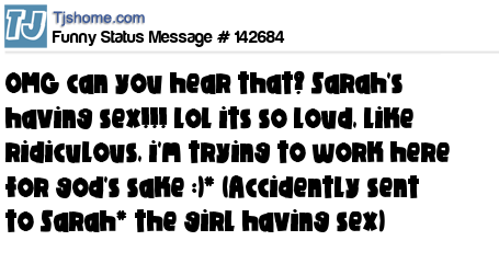 X says OMG can you hear that? Sarah's having sex!!! lol its so loud, like ridiculous, i'm trying to work here for god's sake :)* (Accidently sent to Sarah* the girl having sex)