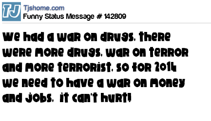 X We had a war on drugs, there were more drugs, war on terror and more terrorist, so for 2014 we need to have a war on money and jobs, it can't hurt!
