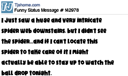 X I just saw a huge and very intricate spider web downstairs, but I didn't see the spider...and if I can't locate this spider to take care of it I might actually be able to stay up to watch the ball drop tonight.