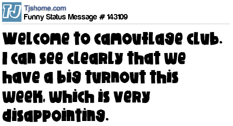 X Welcome to camouflage club. I can see clearly that we have a big turnout this week, which is very disappointing.