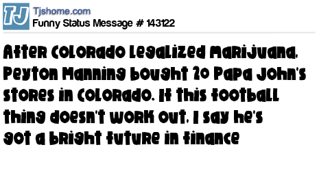 X says After Colorado legalized marijuana, Peyton Manning bought 20 Papa John's stores in Colorado. If this football thing doesn't work out, I say he's got a bright future in finance
