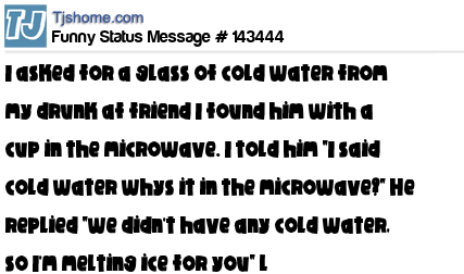 X says I asked for a glass of cold water from my drunk af friend I found him with a cup in the microwave. I told him "I said cold water whys it in the microwave?" He replied "we didn't have any cold water, so I'm melting ice for you" l