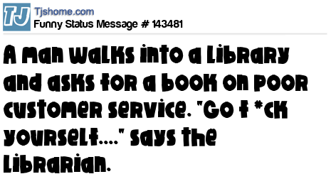X says A man walks into a library and asks for a book on poor customer service. "Go f *ck yourself...." says the librarian.
