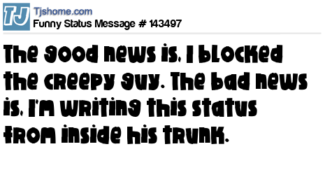 X says The good news is, I blocked the creepy guy. The bad news is, I'm writing this status from inside his trunk.