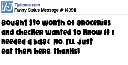 X says Bought $90 worth of groceries and checker wanted to know if I needed a bag:( No, I'll just eat them here, thanks!