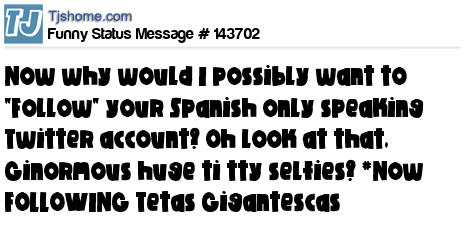 X Now why would I possibly want to "Follow" your Spanish only speaking Twitter account? Oh look at that, Ginormous huge ti tty selfies? *Now FOLLOWING Tetas Gigantescas