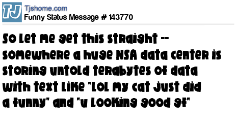 X So let me get this straight -- somewhere a huge NSA data center is storing untold terabytes of data with text like "lol my cat just did a funny" and "u looking good gf"
