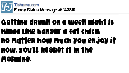 X says Getting drunk on a week night is kinda like bangin' a fat chick; no matter how much you enjoy it now, you'll regret it in the morning.