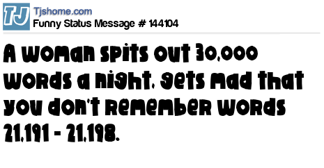 X says A woman spits out 30,000 words a night, gets mad that you don't remember words 21,191 - 21,198.