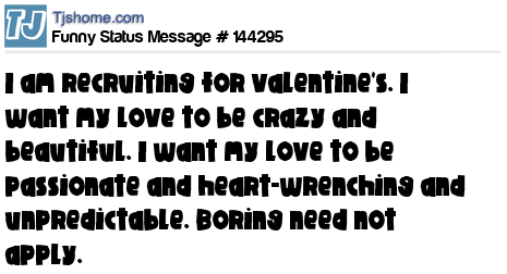 X says I am recruiting for valentine's. I want my love to be crazy and beautiful. I want my love to be passionate and heart-wrenching and unpredictable. Boring need not apply.