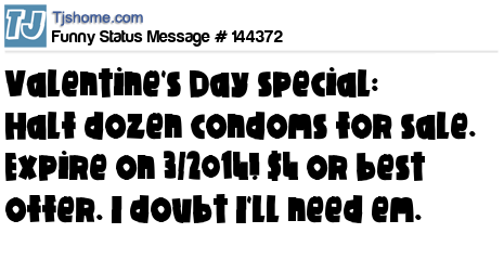 X has Valentine's Day special: Half dozen condoms for sale. Expire on 3/2014! $4 or best offer. I doubt I'll need em.
