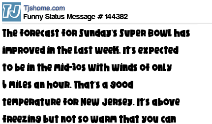 X says The forecast for Sunday's Super Bowl has improved in the last week. It's expected to be in the mid-30s with winds of only 6 miles an hour. That's a good temperature for New Jersey. It's above freezing but not so warm that you can smell the bodies in the s