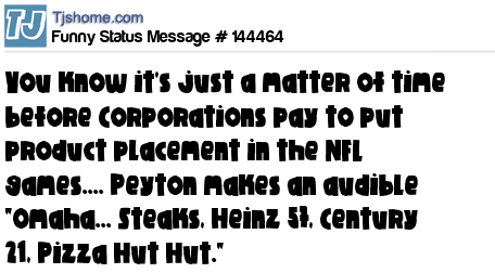 X says You know it's just a matter of time before Corporations pay to put product placement in the NFL games.... Peyton makes an audible "Omaha... Steaks, Heinz 57, Century 21, Pizza Hut Hut."