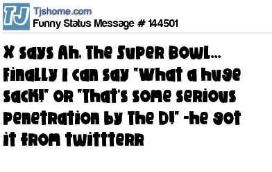 X X says Ah, The Super Bowl... Finally I can say "What a huge sack!" or "That's some serious penetration by The D!" -he got it from twittterr