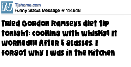 X says Tried Gordon Ramseys diet tip tonight: cooking with whisky! It worked!!! After 5 glasses, I forgot why I was in the kitchen