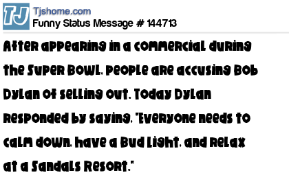 X says After appearing in a commercial during the Super Bowl, people are accusing Bob Dylan of selling out. Today Dylan responded by saying, "Everyone needs to calm down, have a Bud Light, and relax at a Sandals Resort."