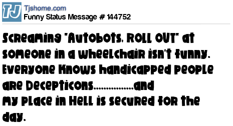 X  Screaming "Autobots, ROLL OUT" at someone in a wheelchair isn't funny. Everyone knows handicapped people are Decepticons................and my place in Hell is secured for the day.
