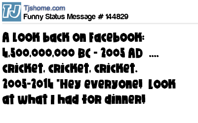 X says A look back on Facebook:  4,500,000,000 BC - 2005 AD  .... cricket, cricket, cricket.  2005-2014 "Hey everyone!  Look at what I had for dinner!