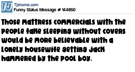 X says Those mattress commercials with the people fake sleeping without covers would be more believable with a lonely housewife getting jack hammered by the pool boy.