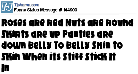 - # 122312 Roses are red, nuts are round, skirts are up, panties are down, belly to belly, skin to skin, when it is stiff, stick it in! Not that's a love poem!