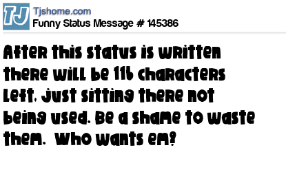 X  after this status is written there will be 116 characters left, just sitting there not being used. Be a shame to waste them.  Who wants em?