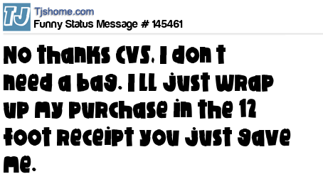 X says No thanks CVS, I don’t need a bag. I’ll just wrap up my purchase in the 12 foot receipt you just gave me.