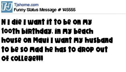 X says n I die I want it to be on my 100th birthday, in my beach house on Maui I want my husband to be so mad he has to drop out of college!!!