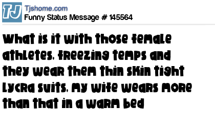 X says What is it with those female athletes, freezing temps and they wear them thin skin tight lycra suits, my wife wears more than that in a warm bed