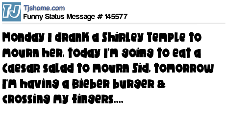 X says Monday I drank a Shirley Temple to mourn her, today I'm going to eat a Caesar salad to mourn Sid, tomorrow I'm having a Bieber burger & crossing my fingers....