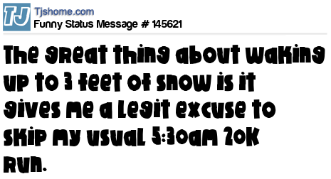 X says The great thing about waking up to 3 feet of snow is it gives me a legit excuse to skip my usual 5:30am 20K run.
