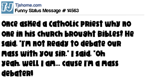 X once asked a Catholic priest why no one in his church brought Bibles? He said, "I'm not ready to debate our mass with you sir." I said, "Oh yeah, well I am... cause I'm a mass debater!