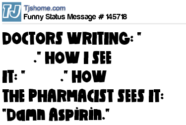 - # 100708 Doctors handwriting: ﹏﹏ ﹏﹏ ﹏. What I see: ǽ₮∂₩£. What the pharmacist sees: Aspirin you dumb ass.