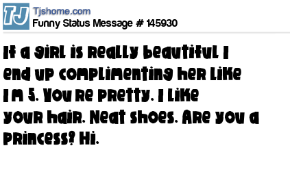 X says If a girl is really beautiful I end up complimenting her like I’m 5. You’re pretty. I like your hair. Neat shoes. Are you a princess? Hi.