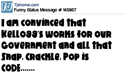 X I am convinced that Kellogg's works for our Government and all that Snap, Crackle, Pop is CODE.......
