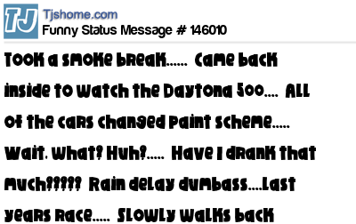 X says Took a smoke break...... Came back inside to watch the Daytona 500.... All of the cars changed paint scheme..... Wait, what? Huh?..... Have I drank that much????? Rain delay dumbass....last years race..... Slowly walks back outside for another smoke